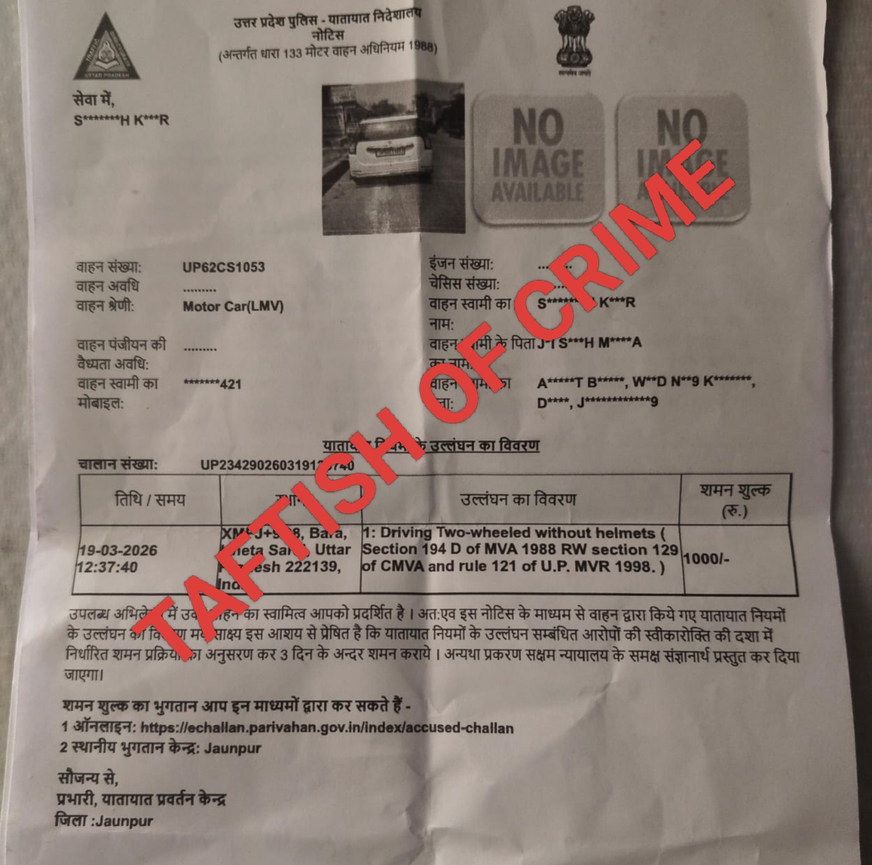 खेतासराय(जौनपुर): यातायात नियमों के पालन को लेकर पुलिस की सख्ती के बीच एक अजीबोगरीब मामला सामने आया है, जिसने पुलिस की कार्यप्रणाली पर सवाल खड़े कर दिए हैं। कस्बा में एक चार पहिया वाहन चालक का नो हेलमेट के उल्लंघन में एक हज़ार रुपये का चालान काट दिया गया, जबकि हेलमेट का नियम दोपहिया वाहनों पर लागू होता है।