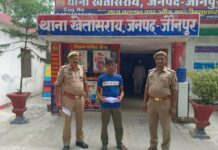 खेतासराय (जौनपुर) अपराध एवं अपराधियों के खिलाफ चलाएं जा रहे अभियान के क्रम में खेतासराय पुलिस टीम ने गैर जमानती वारंट पर फरार एक वारंटी अभियुक्त को पुलिस टीम ने दबोच लिया। थाने लाकर विधिक कार्यवाई करते हुए चालान न्यायालय भेज दिया। थानाध्यक्ष त्रिवेणी सिंह ने बताया कि सोमवार को पाराकमाल निवासी महेंद्र राजभर पुत्र अवध राजभर को घर से दबोच लिया। जिसको थाने लाकर विधिक कार्यवाही करते हुए चालान न्यायालय भेज दिया गया। पुलिस टीम में एसओ त्रिवेणी सिंह, उपनिरीक्षक हरदेव मौर्य समेत अन्य लोग शामिल रहे।
